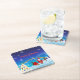Schöne Schneewelt mit einem Weihnachtsbaum, Schneeflocken und einem Regenbogen über dem Himmel. Der Weihnachtsmann winkt und zwei Rentiere hängen zusammen, um Weihnachtsgeschenke zu verteilen.