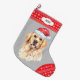 Die Vorderseite dieses Holiday Strumpfs zeigt ein Bild eines Golden Retriever mit einer Weihnachtsmannmütze. Das Bild wird auf einem silbergrauen Hintergrund platziert, und die Zehe und die obere Grenze sind ein rot-weißes Schneeflockenmuster. An der oberen Grenze befindet sich ein weißes Etikett mit dem eigenen Text in dunkelgrau. Die Rückseite des Strumpfs ist das gleiche rote und weiße Schneeflockenmuster.