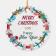 An der Vorderseite dieses Holiday-Ornaments steht ein Bild eines bezaubernden Mops-Hundes mit einer Weihnachtsmannmütze und einem Punkt Schal. Der Hund ist umgeben von einem Weihnachtskranz aus eingewickelten Knochen, goldenen Sternen, Geschenkpackungen und Lichtern mit Streichquellen. Die Rückseite des Ornaments hat den gleichen Kranz mit benutzerdefinierten Text in rot, gold und grün. Ändern Sie das Jahr einfach in einen Namen, um es zu personalisieren, wenn Sie möchten.