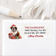 Die links Seite dieser lustigen Holiday-Rücksendeadressen-Aufkleber zeigt ein Bild eines glücklichen Hundes aus Saint Bernard mit einem rot-weißen Hut aus dem Weihnachtsmann. Er sitzt neben hell verpackten Geschenkpaketen. Ihr eigener Text ist rechts rot und schwarz. Ein subtiler goldener Konfetti-Hintergrund gibt ein wenig Weihnachtsfunkel. Schauen Sie sich das Sortiment an Hundeschenkgeschenken und Urlaubsbedürfnissen in unserem Shop an.