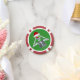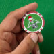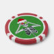 Diese Poker-Chips haben ein albernes Skelett, das rote und grüne Ornamente in den Augen hält und einen roten Weihnachtsmann trägt, der auf einem grünen Hintergrund mit Imitaten goldenen Glitzern vorne und hinten in Fell eingetrimmt ist.