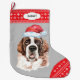Die Vorderseite dieses Holiday Strumpfs zeigt das Bild eines St. Bernard mit einer Weihnachtsmannmütze. Das Bild wird auf einem silbergrauen Hintergrund platziert, und die Zehe und die obere Grenze sind ein rot-weißes Schneeflockenmuster. An der oberen Grenze befindet sich ein weißes Etikett mit dem eigenen Text in dunkelgrau. Die Rückseite des Strumpfs ist das gleiche rote und weiße Schneeflockenmuster.