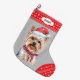 Die Vorderseite dieses Holiday Strumpfs zeigt ein Bild eines Yorkshire Terrier mit einer Weihnachtsmannmütze. Das Bild wird auf einem silbergrauen Hintergrund platziert, und die Zehe und die obere Grenze sind ein rot-weißes Schneeflockenmuster. An der oberen Grenze befindet sich ein weißes Etikett mit dem eigenen Text in dunkelgrau. Die Rückseite des Strumpfs ist das gleiche rote und weiße Schneeflockenmuster.