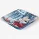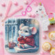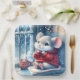 Eine niedliche Maus mit einem gemütlichen, roten Pullover sitzt an einem Fenster mit Schnee, der nach draußen fällt und heißes Getränk in einer roten Tasse