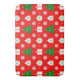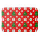 Wiederholte Weihnachtsmuster mit dekorativen Bäumen, Geschenken, Ziergegenständen und Schneeflocken auf einem lebendigen roten Hintergrund, perfekt für feierliche Designs, Ferienkunst und Saisondekorationen.