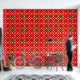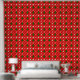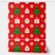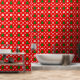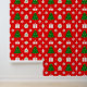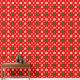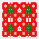 Wiederholte Weihnachtsmuster mit dekorativen Bäumen, Geschenken, Ziergegenständen und Schneeflocken auf einem lebendigen roten Hintergrund, perfekt für feierliche Designs, Ferienkunst und Saisondekorationen.