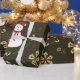 Ein charmantes Urlaubsmuster mit fröhlichen Schneemännern in Weihnachtsmannmützen, goldenen Schneeflocken, roten Bögen und grünen Akzenten auf dunkelgrünem Hintergrund. Dieses festliche Design strahlt Weihnachtsjubeln aus und eignet sich perfekt zum Verpacken von Papier, Urlaubsstimmung oder saisonalen Kunsthandwerk. Die feinen Details und die warme Farbpalette sorgen für einen gemütlichen Urlaubssinn, der sich ideal zum Verweilen während der Weihnachtszeit eignet.