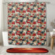 Sehr hübscher Duschvorhang im Weihnachtsdorf mit dem Bild eines Dorfes, Häuser mit roten Dächern, rote Pilze und hübsche Kiefernbäume, in einem Nadelspitze-Effekt.