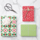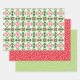 Geschenke unter dem Baum Weihnachts-Flickwerk Quilt Geschenkpapier in traditionellem Rot und Grün. 1) Quilt, 2) Schneeflocken, 3) Bonbonstreifen in Apfelgrün. Volksmäßig, traditionell und so niedlich für diese besonderen Urlaubsgeschenke.