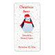 Ein niedliches Etikett, um Ihre speziellen Flaschen Urlaubsbier anzubringen. Es hat einen weißen Hintergrund mit roten und grünen Polka Punkten. Ein Cartoon Pinguin sitzt in der Mitte mit einem roten Winterschal und einer Weihnachtsmannmütze. Ihre individuell gestaltbaren Bierinformationen sind in Rot und Grün gehalten.