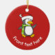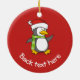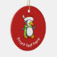 Ein kleiner Pinguin-Cartoon mit Weihnachtsmannmütze und grünem Schal, der auf Schnee geht.