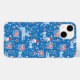 Blaurot-weiße Weihnachtsmustertafel mit niedlichen Vogelgesang und Hirschen, die über Geschenke im Schnee von Sarah Trett rasieren.