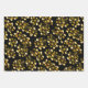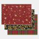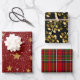Drei schöne Blätter Packpapier, eine ist ein roter Glitzer mit glänzenden und silbernen Herzen, eine mit rotem und grünem Tartan kariert und eine schöne goldene Blatteffekt auf schwarz.