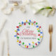 Unterhalten Sie sich stilvoll mit diesem modernen Urlaubsdesign. Ein Kreiskranz altmodischer Weihnachtsleuchten in rot, blau, grün und gelb umkreist die Worte "Frohe Weihnachten" in roter Schrift. Fügen Sie benutzerdefinierten Text hinzu, um den Text zu personalisieren oder zu löschen, falls gewünscht. Diese zeitgenössischen und festlichen Salate wären ein perfektes Kompliment für jeden Urlaub Buffet, Cocktail Party oder familiäre Ansammlung!