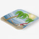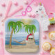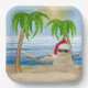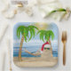 Niedlicher Sandmann mit einer Sonnenbrille und einem Hut auf dem Sand des Strandes mit Sonnenlicht in Palmen und Hängematte.