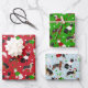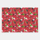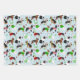 Niedliche Weihnachtshunde in festlichen Urlaubssälen. Deutsche Hirten mit weißen, schwarzen, schwarzen und bräunlichen, schwarzen und roten, schwarzen und silbernen Mäntel tragen Weihnachtsmannmützen, Geweihe, Pullover auf einem roten, grünen und hellblauen Hintergrund mit verstreuten Ziergegenständen, die Papierblätter umhüllen.