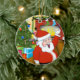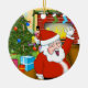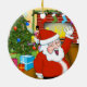 Der Weihnachtsmann machte es den Schornstein runter und jetzt winkt er hallo vor dem dekorierten Kamin mit Strümpfen, umgeben von einem verzierten Weihnachtsbaum mit vielen Geschenken darunter. Diese schöne Szene bildet dieses anpassbare Ornament, sodass Sie Ihren eigenen Text hinzufügen und die Hintergrundfarbe ändern können. Erleben Sie den Urlaub mit diesem festlichen Design.