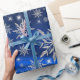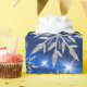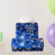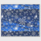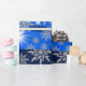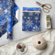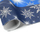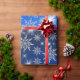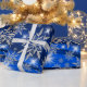 Das Verpackungspapier für Weihnachtsfeiern in der Gestaltung mit den Weihnachtsschmuck mit Schneedekor-Blätter in Retrodrucken mit einer Präsentation der blauen Farbe.