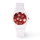 Eine niedliche Uhr für den Urlaub in Weiß mit einem fröhlichen Gesicht in Schneeflocken auf Rot.