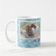 Weihnachts-Foto-Tasse mit weißen Schneeflocken auf hellblauem Hintergrund. Sie können Ihre eigenen Fotos hinzufügen.