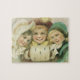 Vintage Abbildung Viktorianisch Frohe Weihnachtsbilder mit drei lächelnden, glücklichen Mädchen. Diese besten Freunde für immer oder Geschwister tragen Winterkleidung mit Hüten und Muffs. Langlebige Freundschaft.