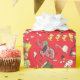 Hübsches Urlaubspapier aus der 50er Jahre. Helles rotes Papier mit allen Spielsachen, von denen die kleinen Kinder träumen. Jack in der Schachtel, Holzsoldat, Puppen, Trommel, gestopfter Elefant und Enten und natürlich Bonbons. Es gibt sogar Kätzchen und ein Känguru.