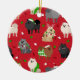 Niedliche Weihnachtshunde in festlichen Urlaubssoutien. Spitz mit Sahne, Schwarz, Bräune, Grau und Schokolade-Kleider tragen Weihnachtsmannmützen, Geweih, Pullover auf einem roten Hintergrund mit verstreuten Ziergegenständen.