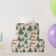 Dekoratives Verpackungspapier mit fröhlichen Weihnachtsbäumen, geschmückt mit Ziergegenständen, Sternenköpfen und farbenfrohen Oldtimer, die den Geist der Urlaubssaison in einem skurrilen Design einfangen.