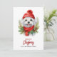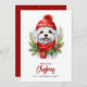 Schöne Aquarellbilder eines maltesischen Hundes mit rotem Schal und Hut im Hintergrund der Weihnachtsgrün.