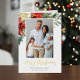 Eine moderne, blumengeschmückte Weihnachtswappenkarte aus vergoldetem Foto. Das Design umfasst rote Aquarellpoinsettia-Blume, goldene Rose und Blätter auf weißem Hintergrund. Die moderne Kalligraphie-Schrift in Goldfolie verleiht eine elegante Touch. DAS PROBENFAMILIENFOTO IST NICHT INBEGRIFFEN. ERSETZEN SIE DAS FOTO VOR DER BESTELLUNG.