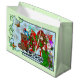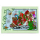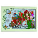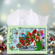 Eine Fee ganz in Rot und Grün in einer Kulisse von Schneeflocken. Rund um sie herum sind Symbole der Feiertage.