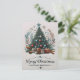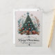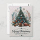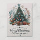 Eine festliche Weihnachtskarte mit einem bunten Weihnachtsbaum, der mit Ziergegenständen und bunten Lichtern geschmückt ist und von wunderschön verpackten Geschenken umgeben ist.