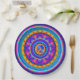 Hand painted artwork inspired by otomi embroidery style decorative patterns. Depicts weimaraner in center of circles and floral patterns along with rabbits running around the outer circles of muli-coloured layers of bright hues on a dark blue background.