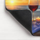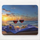 Gläser Wein am Strand als Sonnenuntergang. Ein hübsches, ruhiges Bild mit Kerzen und Blume.
