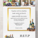 Eine wunderschöne, raffinierte und erstklassige Outdoor-Weinkellerei mit Aquarellfarben, die eine realistische Aquarellgrafik von Holztischen mit knusprigen weißen Tischdecken unter einem Steinbogen mit Blick auf die Weinberge und Täler in der Ferne bietet. Flaschen Wein Set auf einem Holzserver haben Trauben um sie herum und fügen eine Touch von Eleganz und Klasse zu dem Design. Die Vorlagen für den Schwarzen Text für Ihre benutzerdefinierte Formulierung werden durch einen goldenen Rahmen mit quadratischem Rahmen gerahmt, der, falls gewünscht, gelöscht werden kann. Am unteren rechten Rand des Rahmens befinden sich mehr Weinflaschen und Trauben, und der Abreißstreifen am unteren Rand hat auch etwas, Set vor einem weißen und dunkelblauen Hintergrund. Diese Abbildung wird von den Weinbaubetrieben der Welt inspiriert, sei es Portugal, Toskana, Italien, Kapstadt, Neapel oder andere Weinregionen. Feiern Sie Ihre Gewerkschaft mit dieser blauen, weißen, Elfenbein-, Beige-, Grün- und Goldpalette, die sich ideal für ein Brautpaar eignet, das bei der Hochzeit eine Touch von Eleganz und Klasse sucht. Dieses preisgünstige Einladungs-Hotel ist ideal für das anspruchsvolle Paar, das will, sich zu überzeugen.