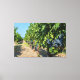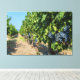 Das Bild zeigt einen Weinberg mit Reihen von Weinreben, die mit reifen, dunkelblauen Trauben beladen sind. Grüne Blätter bedecken die Weinberge und schaffen eine üppige Baumkronen. Der Boden ist trocken und staubig, der Himmel ist klar und blau. Die Perspektive führt den Blick hinunter in die Weinberge, was auf einen riesigen Weinberg hindeutet. Eine schwarze Bewässerungsleitung verläuft entlang der Weinberge.