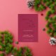 Einfache, vergoldete, Save the Date Karte mit weißem, stilisiertem Schrift auf weinrotem Hintergrund. Bearbeiten Sie Namen und Datum usw. mit Ihren eigenen Informationen. Ändern Sie die Farbe der Folie, falls gewünscht. Die Hintergrundfarbe kann auch geändert werden, um Ihren Hochzeitsfarben anzupassen.