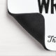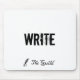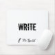 Ein schlichtes weißes mousepad mit dem Wort "SCHREIBEN" und das Logo der Innung in Schwarzweiss.