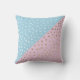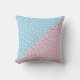 Kissen mit weißen und goldenen Punkten auf blauem und rosa Hintergrund.