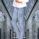 Ein weißes und marineblaues Hahnentrittmuster Leggings.