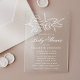 Bewundern Sie die bevorstehende Ankunft mit unserer eleganten Blumen-Babydusche. Dieses zeitlose Design zeichnet sich durch zarte, weiße Blume und Blätter aus, die das Oberteil elegant schmücken, Set vor einem mattierten oder transparenten Acrylhintergrund für eine moderne Touch. Persönliche Einladung mit dem Namen und Duschdetails der künftigen Mutter in klassisch weißer Schrift unten. Diese botanischen Einladungen sind perfekt für eine elegante und unvergessliche Babydusche und werden Ihre Gäste beeindrucken.