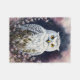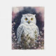 Die Vogelportraitkunst der Blankette zeigt eine weiße Eule mit schwarzen Markierungen, die an eine schneebedeckte Eule erinnern, gerahmt von blühenden Pflanze gegen einen Nachthimmel. Ein cooles Farbschema aus Mitternachtsblau und Lila kombiniert mit botanischen Elementen und einem gruseligen Vogel.