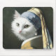 Eine weiße Katze mit blauem und gelbem Kopftuch und Perlenohrring, die einem berühmten Portrait ähnelt