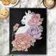 Ein Profil einer weißen Katze mit rosa, lavender und pfirsichfarbenen Rose in schwarzer Umgebung