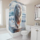 Dieser Duschvorhang hat einen weißen Löwen darauf.