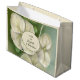 Auf beiden Seiten dieses Geschenksacks sind in Pastelltönen Kunstwerke mit eleganten, cremefarbenen und weißen Hydrangea-Blume mit ihren Knospen auf einem abgestuften Grün und einem cremig gelben.