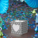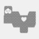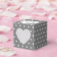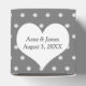 Weißes Herz mit neu verheirateten Namen und weißen Perlen auf grauem Hintergrund. Die Hintergrundfarbe kann geändert werden.
