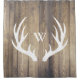 Weiße Rotwildgeweih-Silhouette mit weißem Monogrammmittelbuchstaben. Hintergrund ist ein helles Scheunenholz mit natürlichem Korn. Wow Ihre Gäste mit diesem schicken Duschvorhang des großen Bauernhauses.