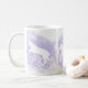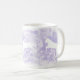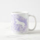 Diese klassische weiße Tasse wurde mit meiner Darstellung von zwei weißen Pferden entworfen, die auf einem Lavendelhintergrund springen.