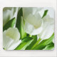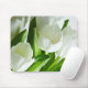 Weiße Tulpen mit Wasser fällt auf weißen Hintergrund